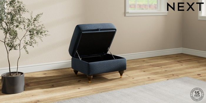 7.2.10 Ashford Storage Footstool Ripple Chenille Dark Blue Modern Turned Metal Cap - Mid | Made Click here to use our website with more accessibility support, for example screen readers