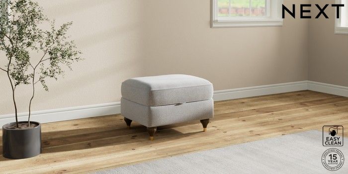 7.2.10 Ashford Storage Footstool Tweedy Blend Easy Clean Light Silver Grey Modern Turned Metal Cap - Mid | Made Click here to use our website with more accessibility support, for example screen readers