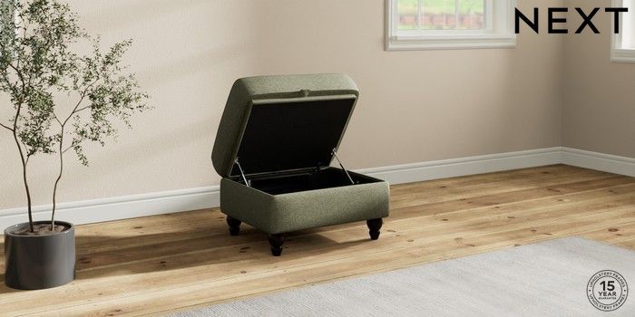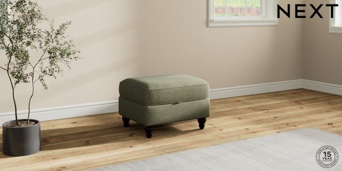 7.2.10 Ashford Storage Footstool Tweedy Chenille Mid Moss Green Low Turned - Dark | Made Click here to use our website with more accessibility support, for example screen readers