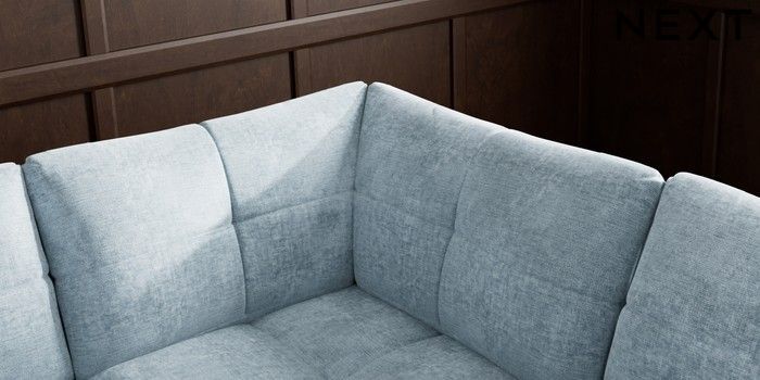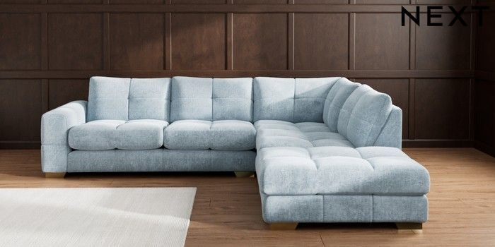 7.2.10 Brooke Deep Sit Large Open End Corner Chaise - Right Hand Plush Chenille Light Blue Large Square Angle - Brushed Brass | Made Click here to use our website with more accessibility support, for example screen readers