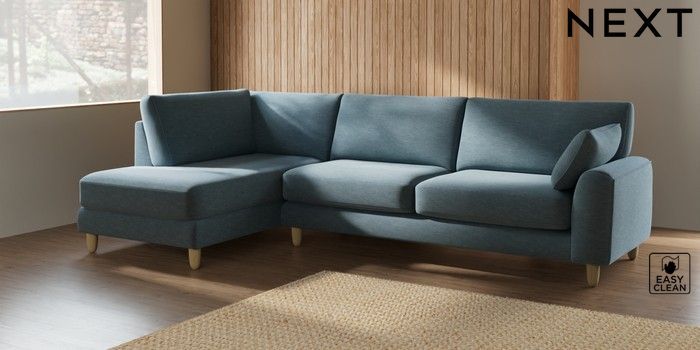 7.2.10 Campbell Large Corner Chaise - Left Hand Fine Chenille Easy Clean Mid Blue High Leg - Light | Made Click here to use our website with more accessibility support, for example screen readers