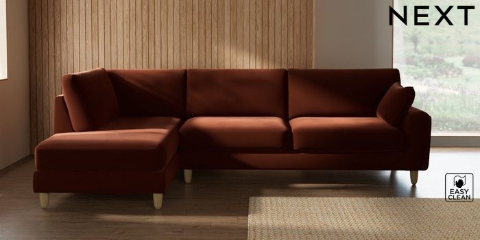 7.2.10 Campbell Large Corner Chaise - Left Hand Plush Velvet Easy Clean Ginger Orange High Leg - Light | Made Click here to use our website with more accessibility support, for example screen readers