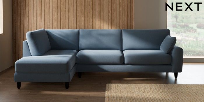 7.2.10 Campbell Large Corner Chaise - Left Hand Relaxed Linen Look Mid Blue High Leg - Dark | Made Click here to use our website with more accessibility support, for example screen readers