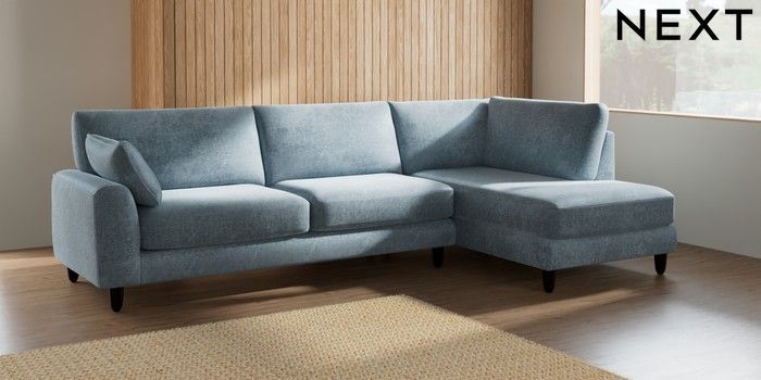7.2.10 Campbell Large Corner Chaise - Right Hand Plush Chenille Light Blue High Leg - Dark | Made Click here to use our website with more accessibility support, for example screen readers