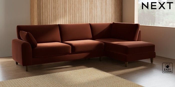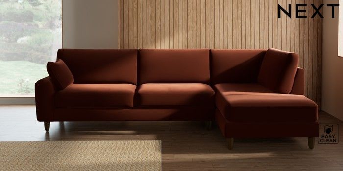 7.2.10 Campbell Large Corner Chaise - Right Hand Plush Velvet Easy Clean Ginger Orange High Leg - Mid | Made Click here to use our website with more accessibility support, for example screen readers