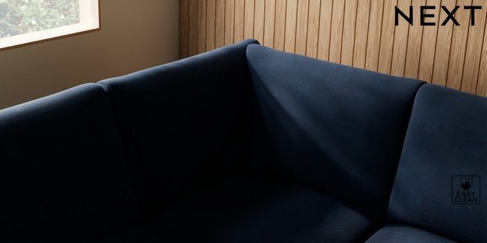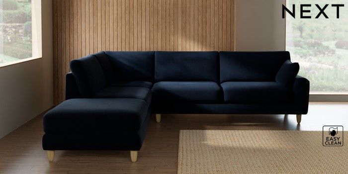 7.2.10 Campbell Large Open End Corner Chaise - Left Hand Fine Chenille Easy Clean Dark Navy Blue High Leg - Light | Made Click here to use our website with more accessibility support, for example screen readers