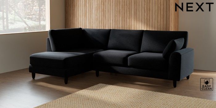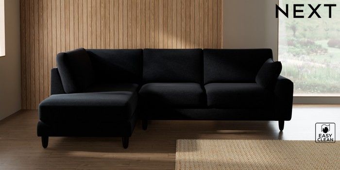 7.2.10 Campbell Medium Corner Chaise - Left Hand Fine Chenille Easy Clean Black High Leg - Dark | Made Click here to use our website with more accessibility support, for example screen readers