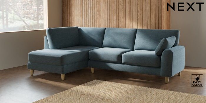 7.2.10 Campbell Medium Corner Chaise - Left Hand Fine Chenille Easy Clean Mid Blue High Leg - Light | Made Click here to use our website with more accessibility support, for example screen readers