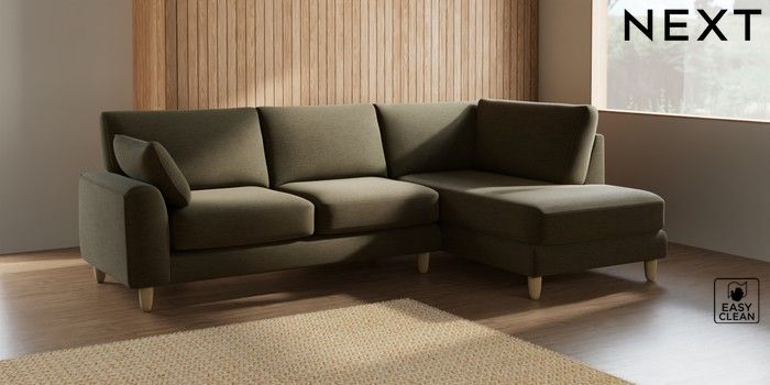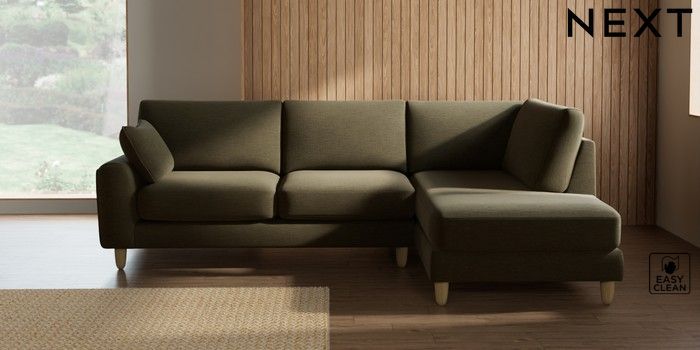 7.2.10 Campbell Medium Corner Chaise - Right Hand Fine Chenille Easy Clean Dark Moss Green High Leg - Light | Made Click here to use our website with more accessibility support, for example screen readers