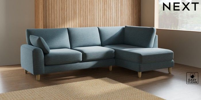 7.2.10 Campbell Medium Corner Chaise - Right Hand Fine Chenille Easy Clean Mid Blue High Leg - Light | Made Click here to use our website with more accessibility support, for example screen readers