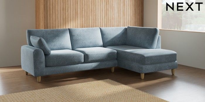 7.2.10 Campbell Medium Corner Chaise - Right Hand Plush Chenille Light Blue High Leg - Light | Made Click here to use our website with more accessibility support, for example screen readers