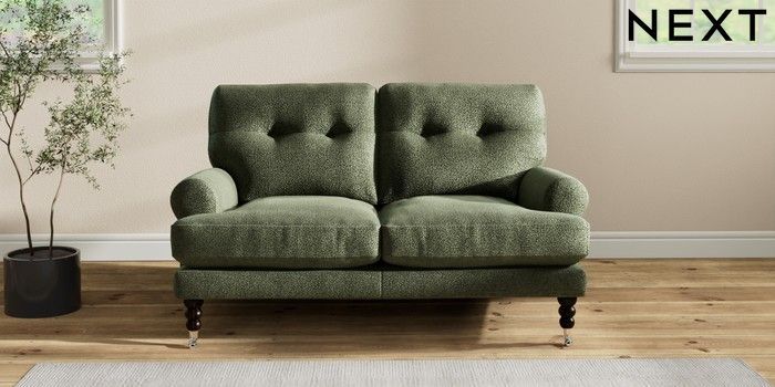 7.2.10 Erin Buttoned Back Deep Relaxed Sit 2 Seater Small Sofa Boucle Chenille Dark Moss Green High Classic Turned Chrome Castor - Dark | Made Click here to use our website with more accessibility support, for example screen readers