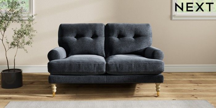 7.2.10 Erin Buttoned Back Deep Relaxed Sit 2 Seater Small Sofa Boucle Chenille Dark Slate Blue High Classic Turned Brass Castor - Light | Made Click here to use our website with more accessibility support, for example screen readers