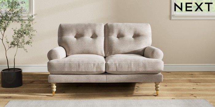 7.2.10 Erin Buttoned Back Deep Relaxed Sit 2 Seater Small Sofa Boucle Chenille Light Natural High Classic Turned Brass Castor - Light | Made Click here to use our website with more accessibility support, for example screen readers