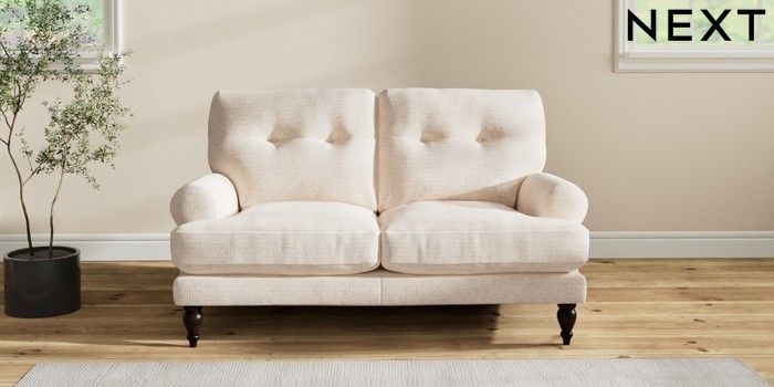 7.2.10 Erin Buttoned Back Deep Relaxed Sit 2 Seater Small Sofa Boucle Chenille Oyster High Classic Turned - Dark | Made Click here to use our website with more accessibility support, for example screen readers