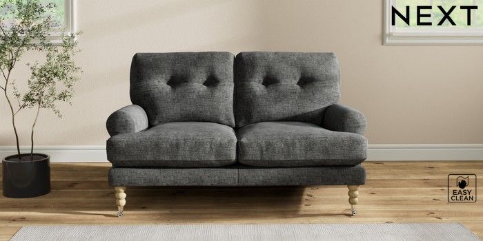 7.2.10 Erin Buttoned Back Deep Relaxed Sit 2 Seater Small Sofa Boucle Weave Easy Clean Charcoal Grey High Classic Turned Chrome Castor - Light | Made Click here to use our website with more accessibility support, for example screen readers