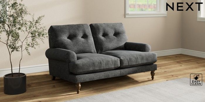 7.2.10 Erin Buttoned Back Deep Relaxed Sit 2 Seater Small Sofa Boucle Weave Easy Clean Charcoal Grey High Classic Turned - Mid | Made Click here to use our website with more accessibility support, for example screen readers