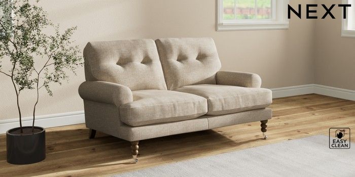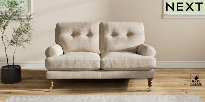7.2.10 Erin Buttoned Back Deep Relaxed Sit 2 Seater Small Sofa Boucle Weave Easy Clean Dark Natural High Classic Turned Chrome Castor - Mid | Made Click here to use our website with more accessibility support, for example screen readers