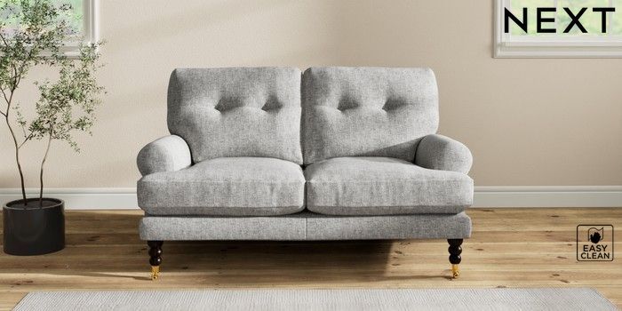 7.2.10 Erin Buttoned Back Deep Relaxed Sit 2 Seater Small Sofa Chunky Boucle Easy Clean Light Grey High Classic Turned Brass Castor - Dark | Made Click here to use our website with more accessibility support, for example screen readers