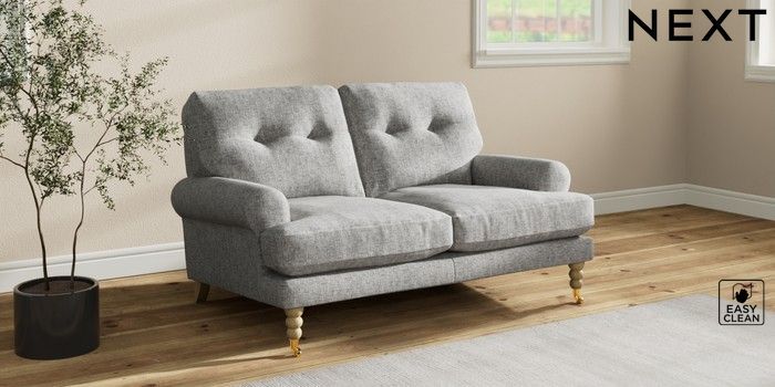 7.2.10 Erin Buttoned Back Deep Relaxed Sit 2 Seater Small Sofa Chunky Boucle Easy Clean Light Grey High Classic Turned Brass Castor - Light | Made Click here to use our website with more accessibility support, for example screen readers