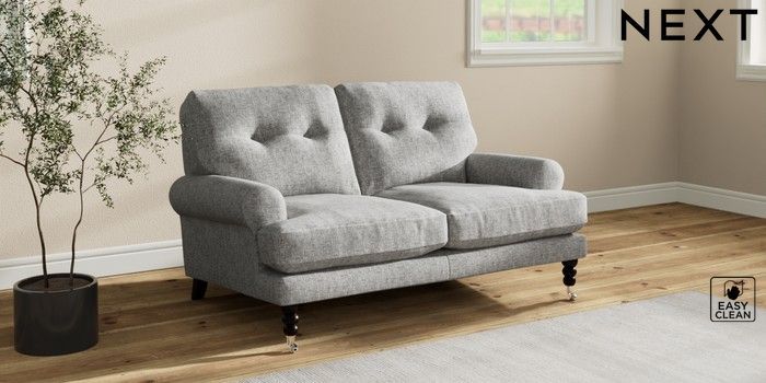 7.2.10 Erin Buttoned Back Deep Relaxed Sit 2 Seater Small Sofa Chunky Boucle Easy Clean Light Grey High Classic Turned Chrome Castor - Dark | Made Click here to use our website with more accessibility support, for example screen readers