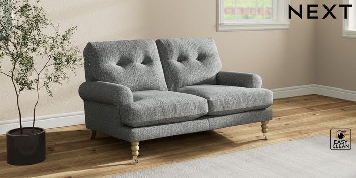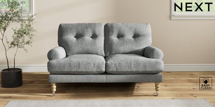 7.2.10 Erin Buttoned Back Deep Relaxed Sit 2 Seater Small Sofa Chunky Boucle Easy Clean Mid Grey High Classic Turned Chrome Castor - Light | Made Click here to use our website with more accessibility support, for example screen readers