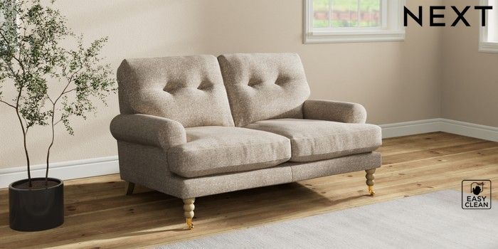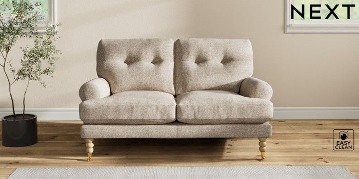 7.2.10 Erin Buttoned Back Deep Relaxed Sit 2 Seater Small Sofa Chunky Boucle Easy Clean Mid Natural High Classic Turned Brass Castor - Light | Made Click here to use our website with more accessibility support, for example screen readers