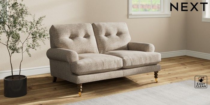 7.2.10 Erin Buttoned Back Deep Relaxed Sit 2 Seater Small Sofa Chunky Boucle Easy Clean Mid Natural High Classic Turned Brass Castor - Mid | Made Click here to use our website with more accessibility support, for example screen readers