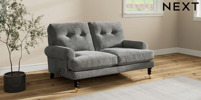 7.2.10 Erin Buttoned Back Deep Relaxed Sit 2 Seater Small Sofa Chunky Chenille Dark Grey High Classic Turned Brass Castor - Dark | Made Click here to use our website with more accessibility support, for example screen readers