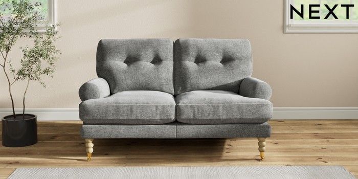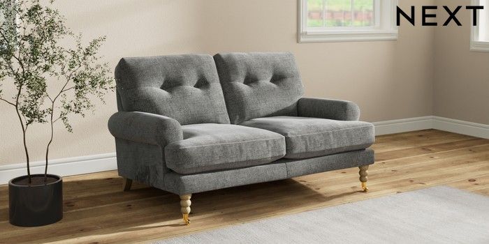 7.2.10 Erin Buttoned Back Deep Relaxed Sit 2 Seater Small Sofa Chunky Chenille Dark Grey High Classic Turned Brass Castor - Light | Made Click here to use our website with more accessibility support, for example screen readers
