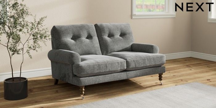 7.2.10 Erin Buttoned Back Deep Relaxed Sit 2 Seater Small Sofa Chunky Chenille Dark Grey High Classic Turned Chrome Castor - Mid | Made Click here to use our website with more accessibility support, for example screen readers