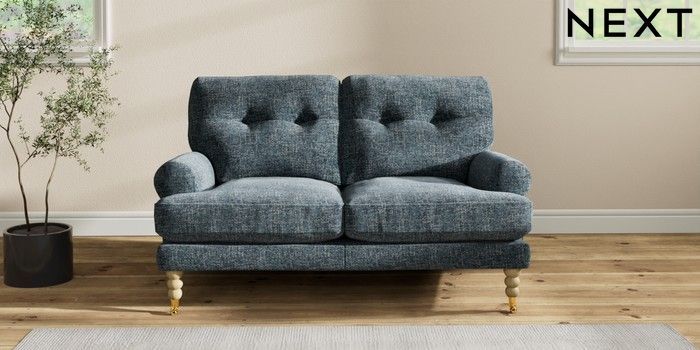 7.2.10 Erin Buttoned Back Deep Relaxed Sit 2 Seater Small Sofa Chunky Chenille Dark Navy Blue High Classic Turned Brass Castor - Light | Made Click here to use our website with more accessibility support, for example screen readers