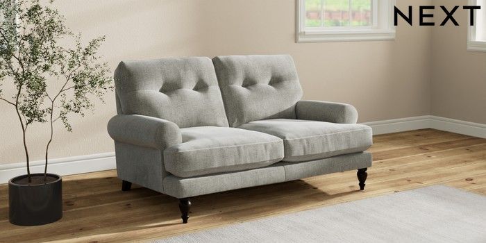 7.2.10 Erin Buttoned Back Deep Relaxed Sit 2 Seater Small Sofa Chunky Chenille Light Grey High Classic Turned - Dark | Made Click here to use our website with more accessibility support, for example screen readers
