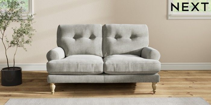 7.2.10 Erin Buttoned Back Deep Relaxed Sit 2 Seater Small Sofa Chunky Chenille Light Grey High Classic Turned - Light | Made Click here to use our website with more accessibility support, for example screen readers