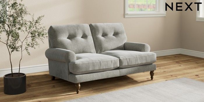 7.2.10 Erin Buttoned Back Deep Relaxed Sit 2 Seater Small Sofa Chunky Chenille Light Grey High Classic Turned - Mid | Made Click here to use our website with more accessibility support, for example screen readers