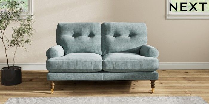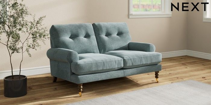 7.2.10 Erin Buttoned Back Deep Relaxed Sit 2 Seater Small Sofa Chunky Chenille Light Teal Green High Classic Turned Brass Castor - Mid | Made Click here to use our website with more accessibility support, for example screen readers
