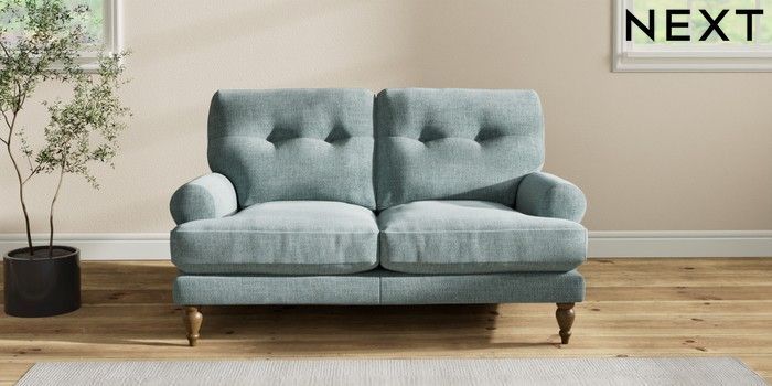 7.2.10 Erin Buttoned Back Deep Relaxed Sit 2 Seater Small Sofa Chunky Chenille Light Teal Green High Classic Turned - Mid | Made Click here to use our website with more accessibility support, for example screen readers