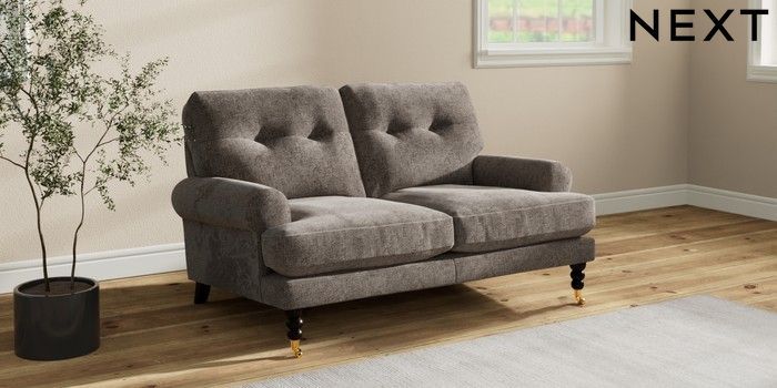 7.2.10 Erin Buttoned Back Deep Relaxed Sit 2 Seater Small Sofa Chunky Chenille Mink Brown High Classic Turned Brass Castor - Dark | Made Click here to use our website with more accessibility support, for example screen readers