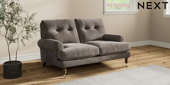 7.2.10 Erin Buttoned Back Deep Relaxed Sit 2 Seater Small Sofa Chunky Chenille Mink Brown High Classic Turned Chrome Castor - Mid | Made Click here to use our website with more accessibility support, for example screen readers