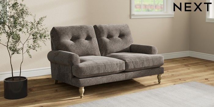 7.2.10 Erin Buttoned Back Deep Relaxed Sit 2 Seater Small Sofa Chunky Chenille Mink Brown High Classic Turned - Light | Made Click here to use our website with more accessibility support, for example screen readers