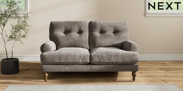 7.2.10 Erin Buttoned Back Deep Relaxed Sit 2 Seater Small Sofa Chunky Chenille Mink Brown High Classic Turned - Mid | Made Click here to use our website with more accessibility support, for example screen readers