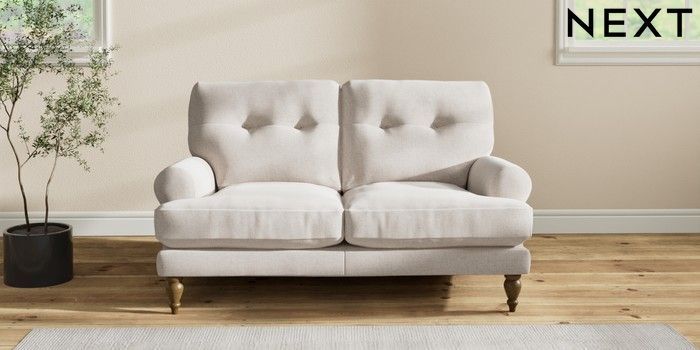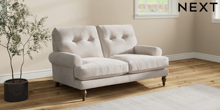 7.2.10 Erin Buttoned Back Deep Relaxed Sit 2 Seater Small Sofa Chunky Chenille Oyster High Classic Turned - Mid | Made Click here to use our website with more accessibility support, for example screen readers