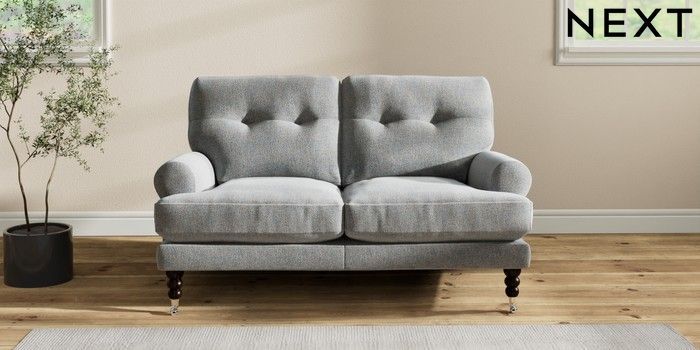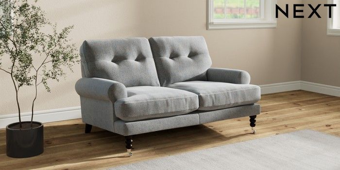 7.2.10 Erin Buttoned Back Deep Relaxed Sit 2 Seater Small Sofa Chunky Marl Mid Grey High Classic Turned Chrome Castor - Dark | Made Click here to use our website with more accessibility support, for example screen readers