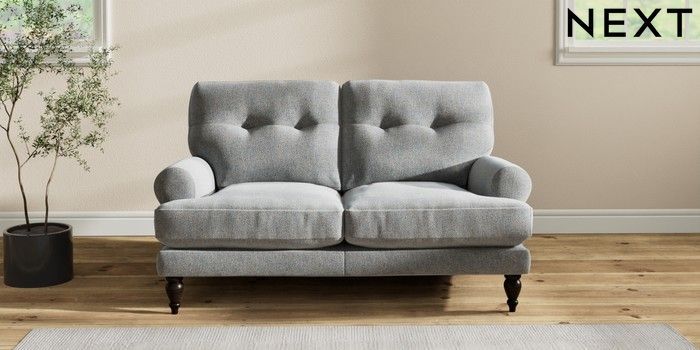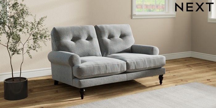 7.2.10 Erin Buttoned Back Deep Relaxed Sit 2 Seater Small Sofa Chunky Marl Mid Grey High Classic Turned - Dark | Made Click here to use our website with more accessibility support, for example screen readers