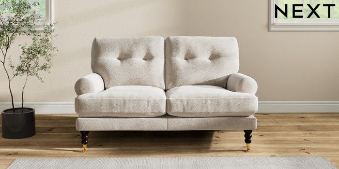 7.2.10 Erin Buttoned Back Deep Relaxed Sit 2 Seater Small Sofa Chunky Marl Oyster High Classic Turned Brass Castor - Dark | Made Click here to use our website with more accessibility support, for example screen readers