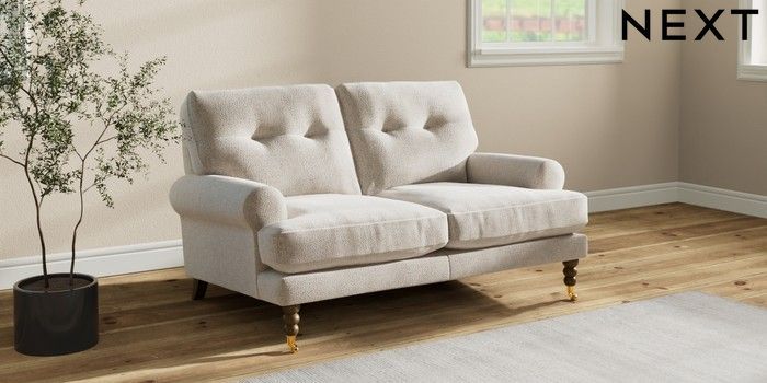 7.2.10 Erin Buttoned Back Deep Relaxed Sit 2 Seater Small Sofa Chunky Marl Oyster High Classic Turned Brass Castor - Mid | Made Click here to use our website with more accessibility support, for example screen readers