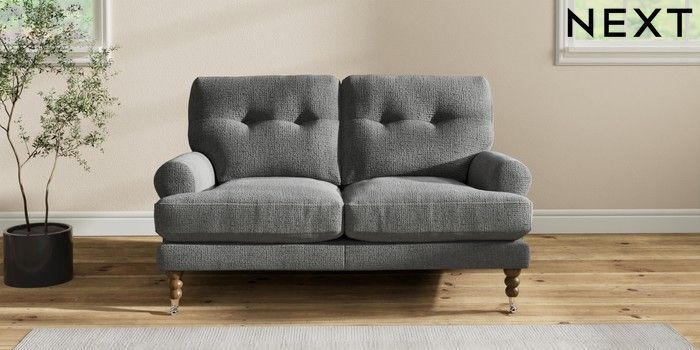 7.2.10 Erin Buttoned Back Deep Relaxed Sit 2 Seater Small Sofa Chunky Texture Dark Grey High Classic Turned Chrome Castor - Mid | Made Click here to use our website with more accessibility support, for example screen readers