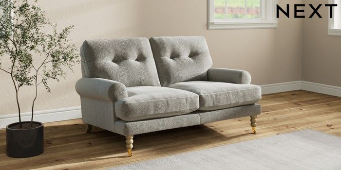 7.2.10 Erin Buttoned Back Deep Relaxed Sit 2 Seater Small Sofa Chunky Texture Dove High Classic Turned Brass Castor - Light | Made Click here to use our website with more accessibility support, for example screen readers