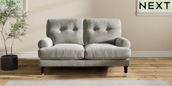7.2.10 Erin Buttoned Back Deep Relaxed Sit 2 Seater Small Sofa Chunky Texture Dove High Classic Turned Chrome Castor - Dark | Made Click here to use our website with more accessibility support, for example screen readers