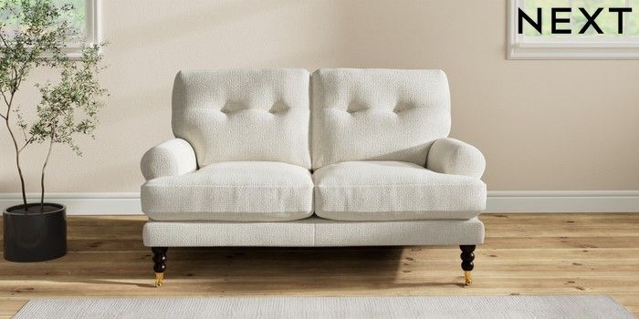 7.2.10 Erin Buttoned Back Deep Relaxed Sit 2 Seater Small Sofa Chunky Texture Oyster High Classic Turned Brass Castor - Dark | Made Click here to use our website with more accessibility support, for example screen readers